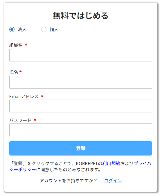 まず、「法人」を選び、組織名・氏名・Emailアドレス・パスワードを入力し、「登録」をクリックしてください。