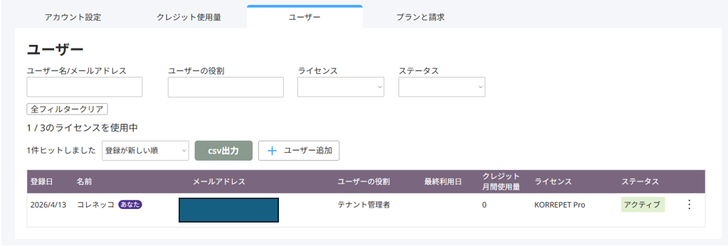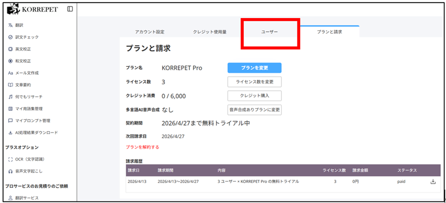 KORREPETのトライアルユーザーは、最大3名まで登録できます。