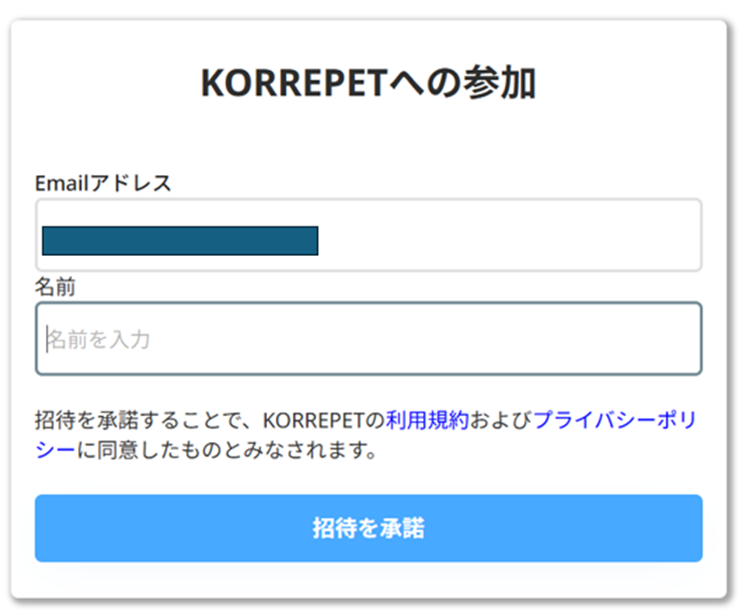 「KORREPETへの参加」画面が表示されます。