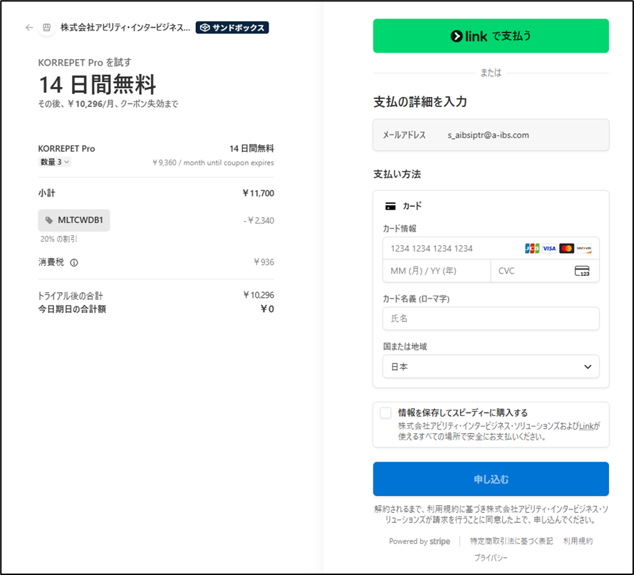 支払い方法の登録画面が表示されます。
